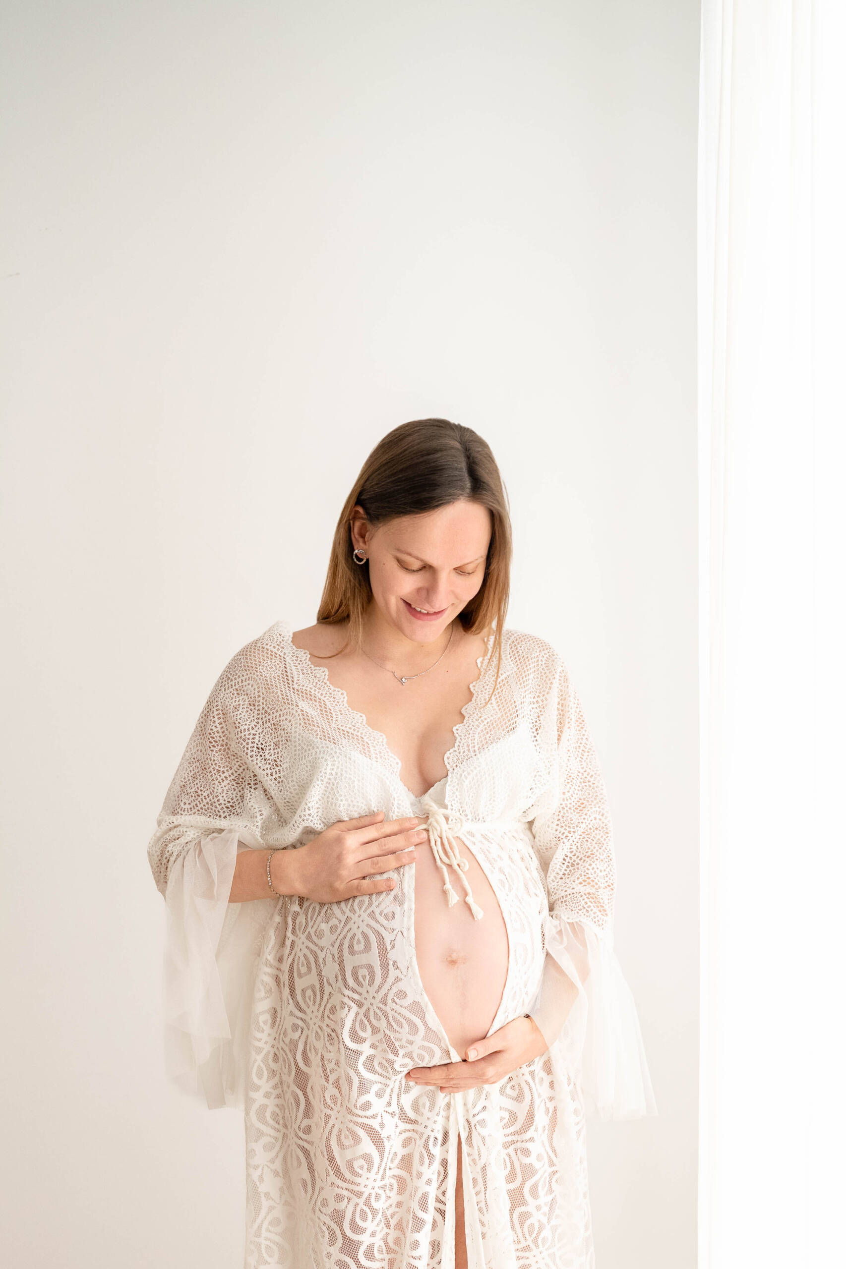 Et sur place, vous avez aussi accès à des tenues sélectionnées spécialement pour la photographie de grossesse : des robes aux coupes fluides et confortables, dans des teintes douces et lumineuses, beige, blanc, rose poudré …, qui fonctionnent dans toutes les ambiances du studio et traversent le temps sans vieillir.
