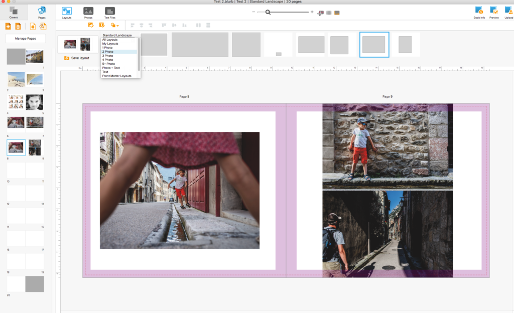 La qualité d’impression est là et leur outil de mise en page, vraiment bien fait, vous permettra de gérer votre mise en page rapidement et facilement. Book Wright, leur programme d’édition, permet de travailler en ligne ou hors ligne selon la version choisie. Le chargement des photos est simple et rapide. Et leur interface propose des Layouts de mise en page variés et classés selon le nombre de photos à mettre en page. Les mises en page manquent peut-être d’originalité pour ceux qui aime faire des montage et des découpes dans leur photo. Ce programme laisse par contre de la latitude pour adapter les layouts ou faire une mise en page personnalisée.